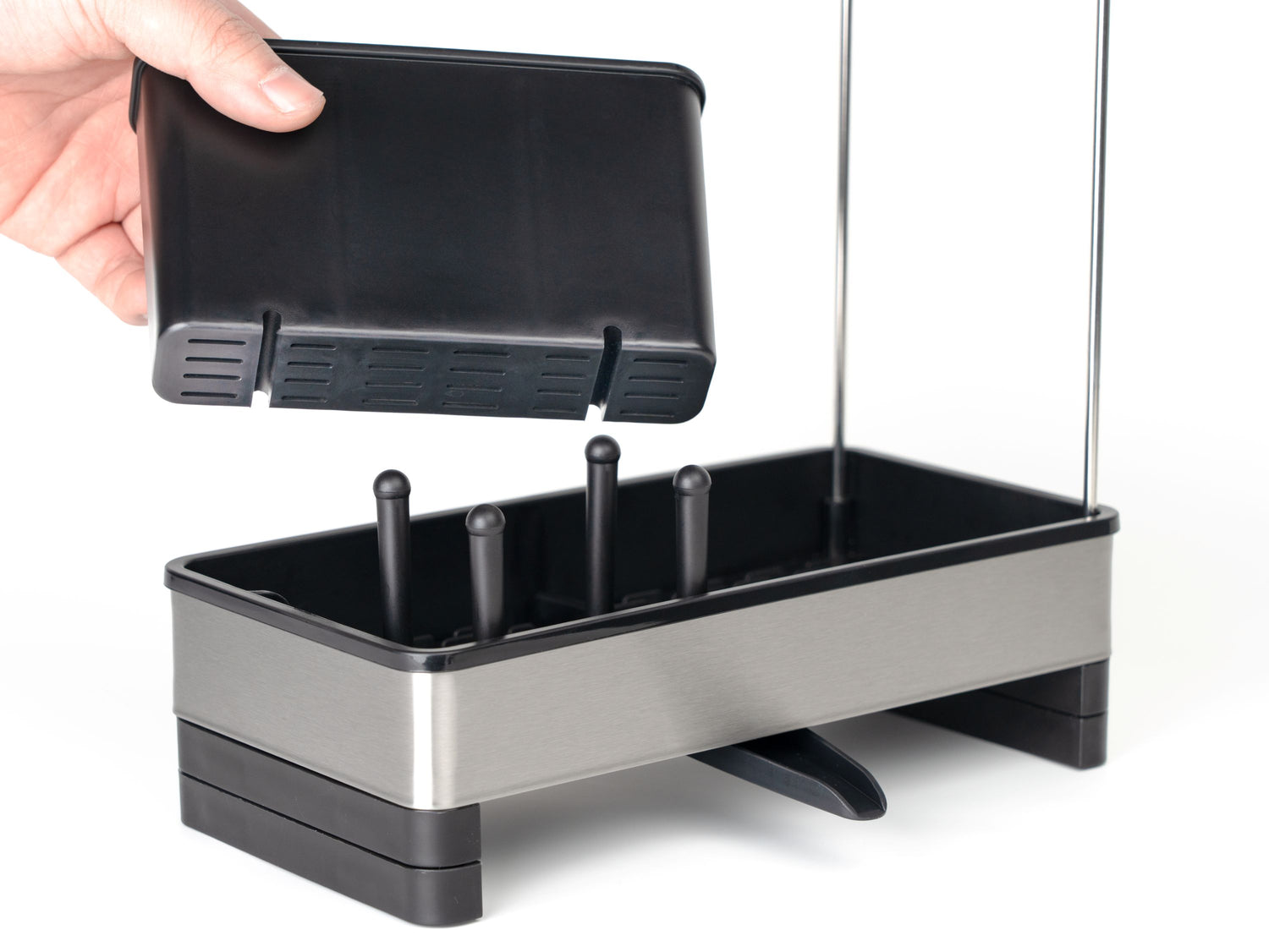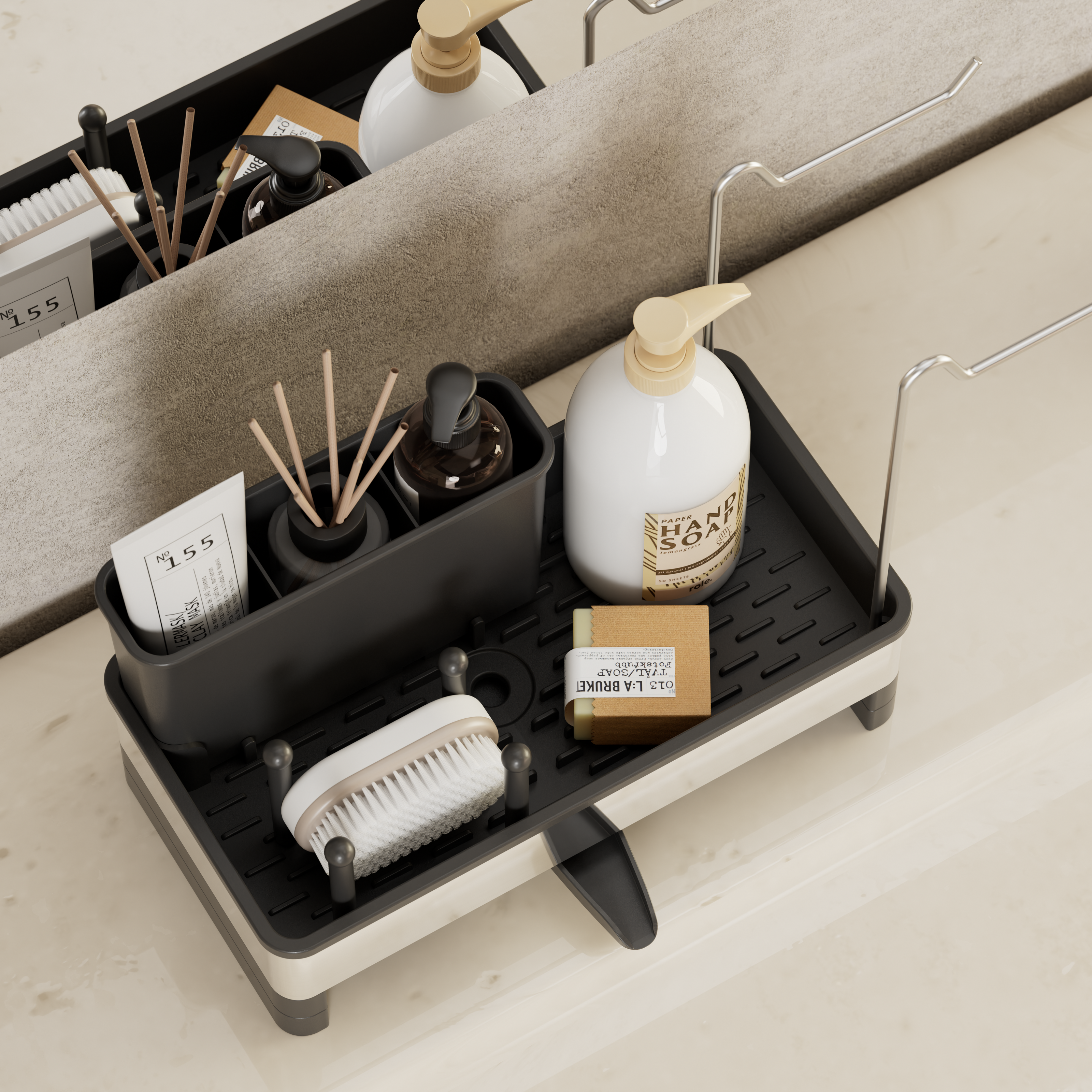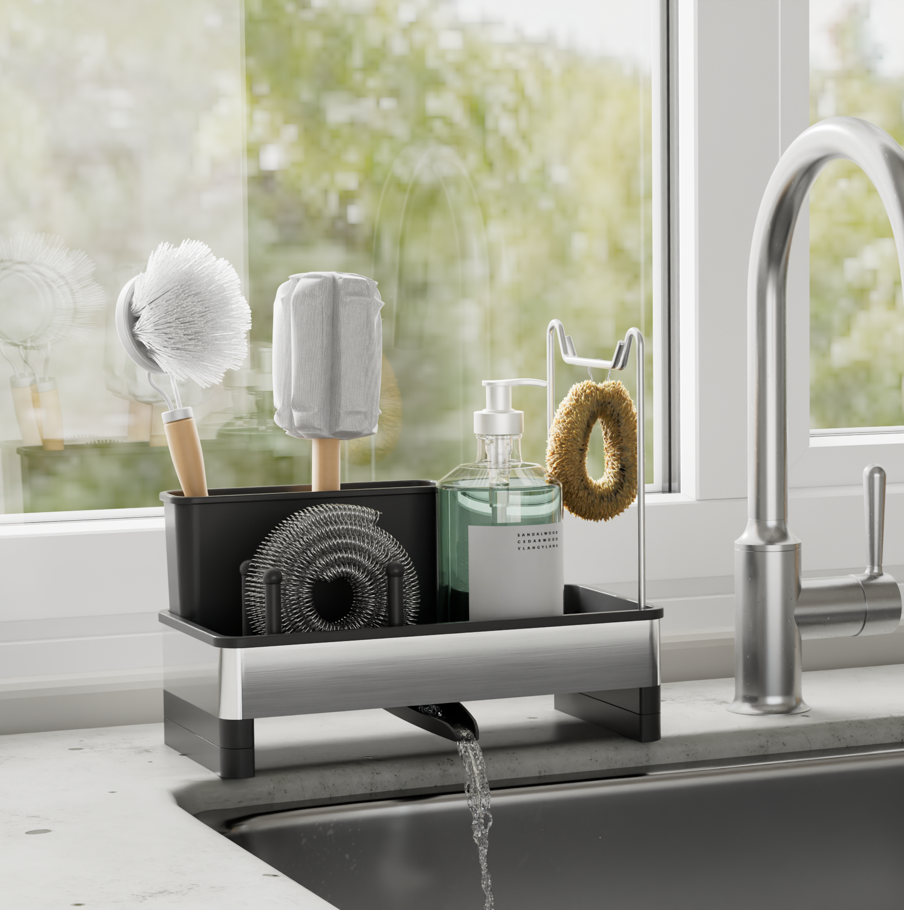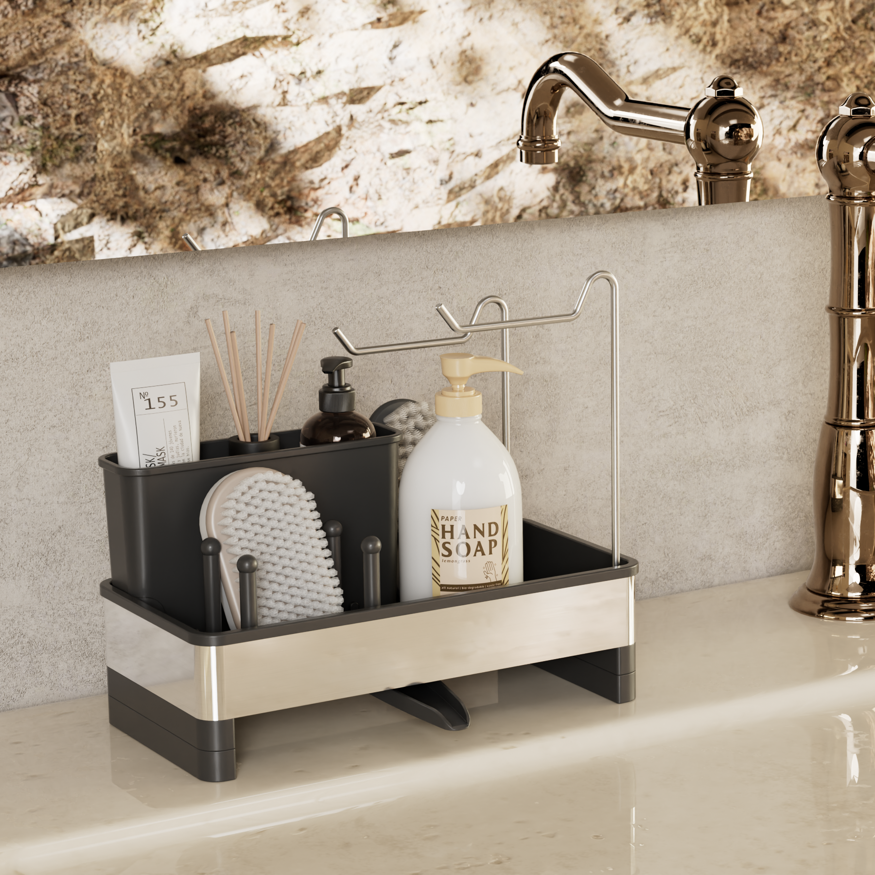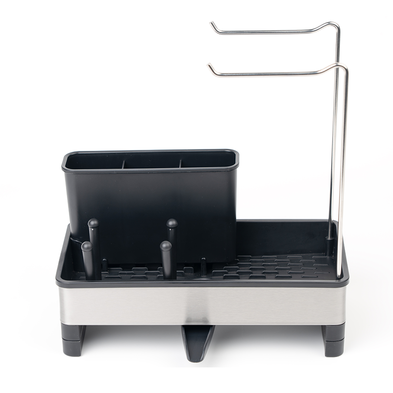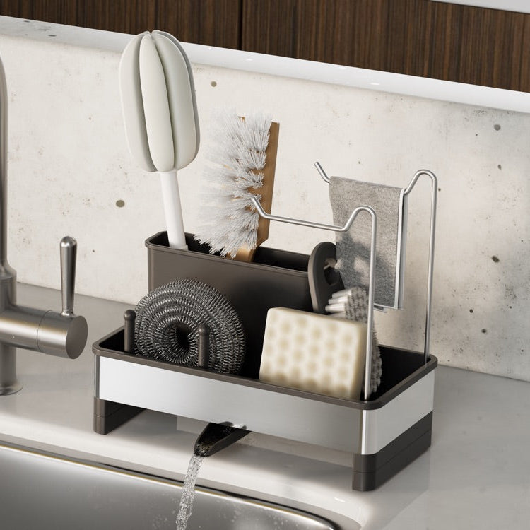 Cuenta con un compartimento profundo para jabón de platos o cepillos y rieles dobles de acero inoxidable para colgar paños de cocina para garantizar un secado rápido y cero olores.